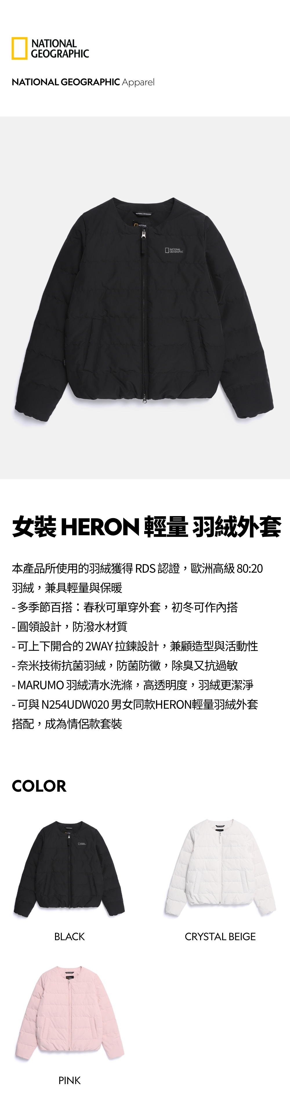 - 可與 N254UDW020 男女同款HERON輕量羽絨外套搭配,成為情侶款套裝