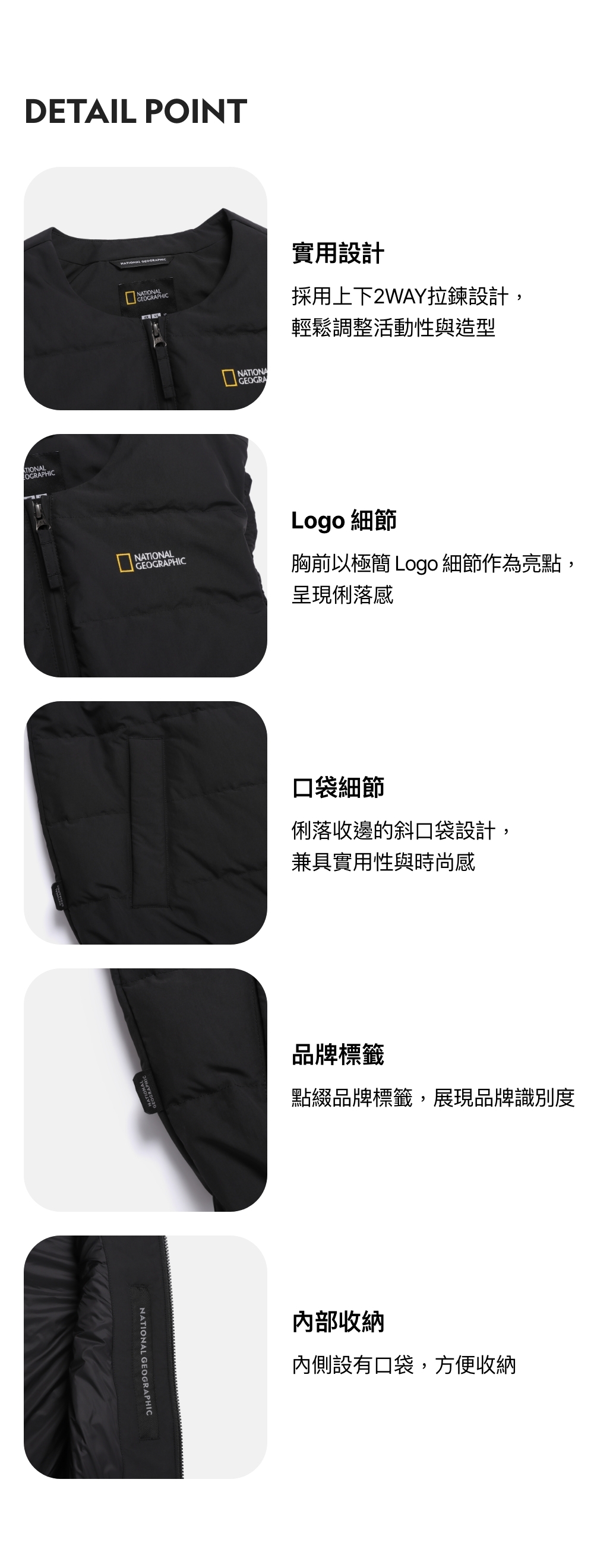 - 可上下開合的 2WAY 拉鍊設計,兼顧造型與活動性