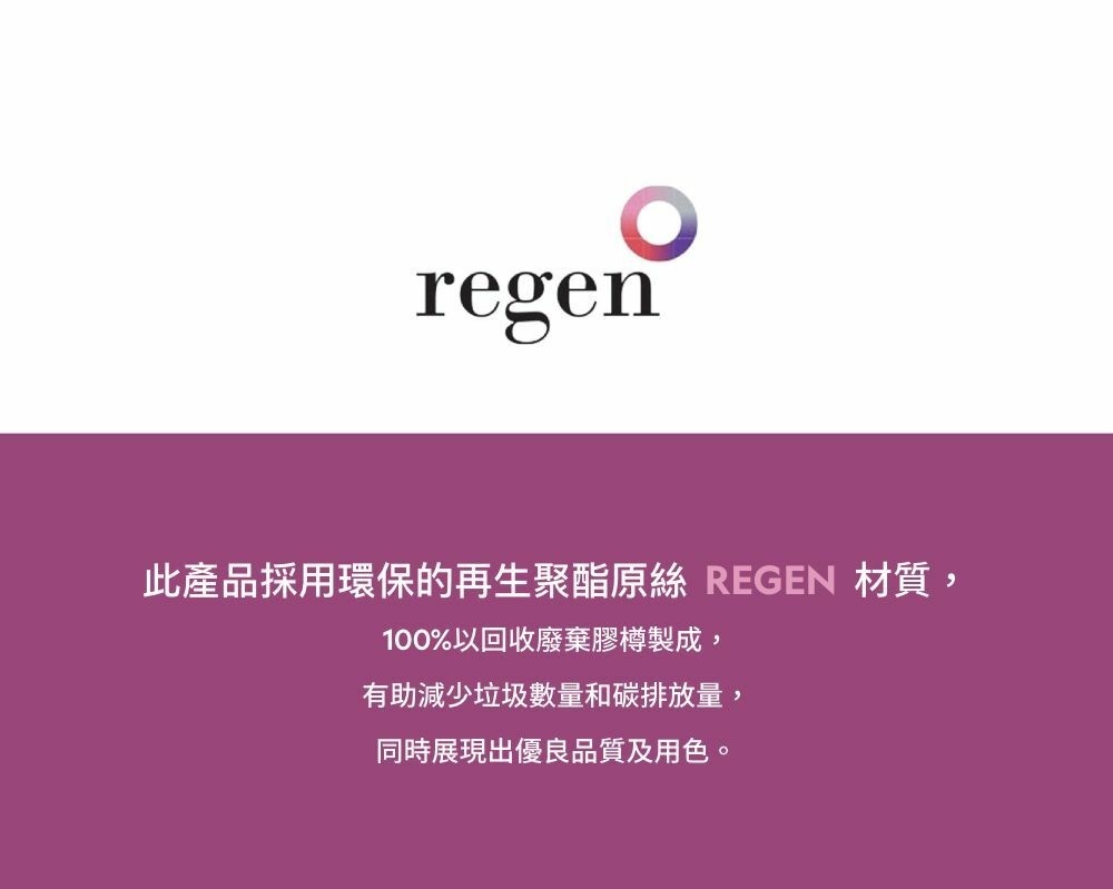 ※ 【REGEN】環保材質,由再生聚酯原絲(100%回收廢棄膠樽)製造而成,減少對環境的污染。特性:高透氣性、吸濕速乾。