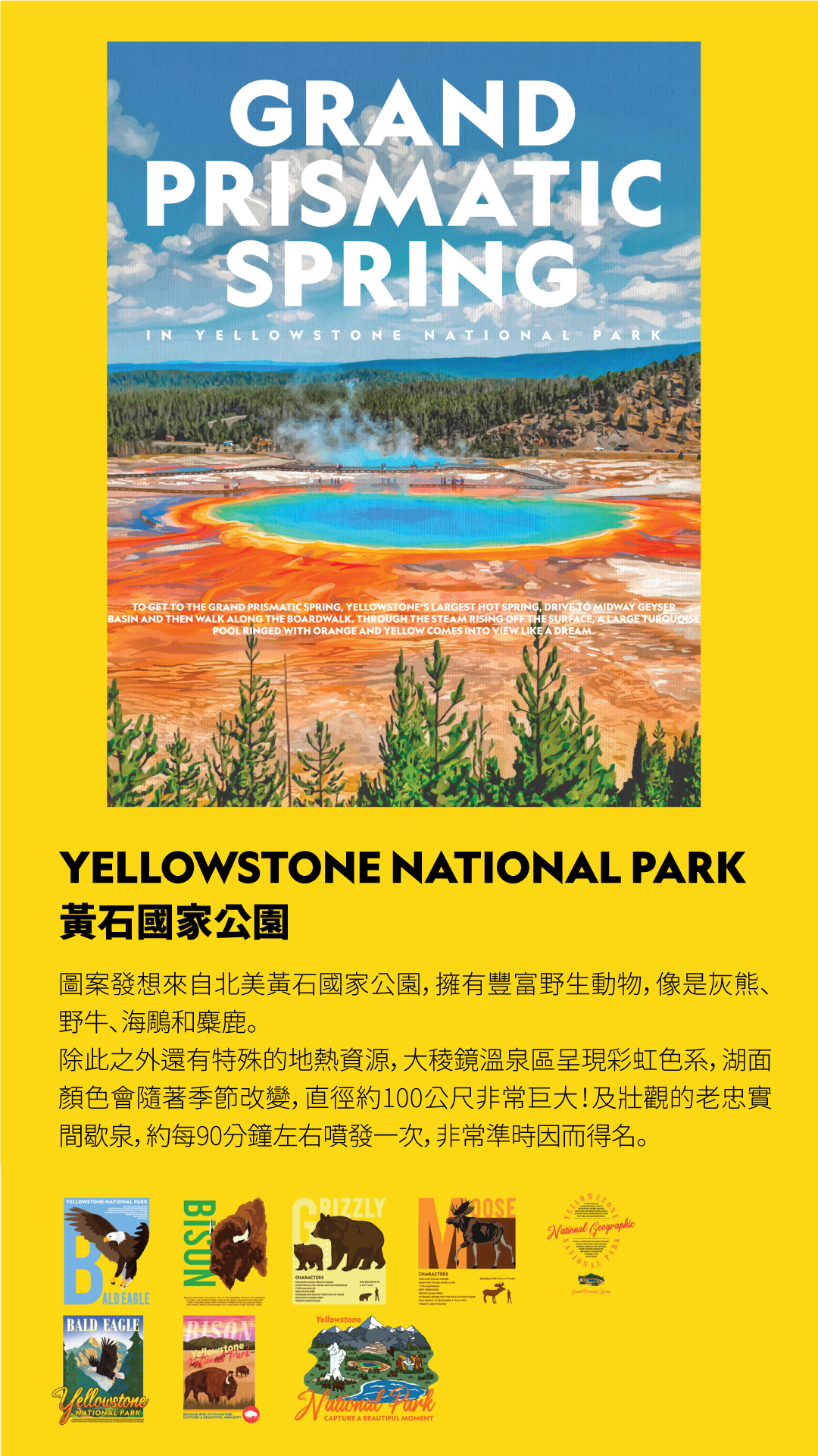 - 背面有以黃石國家公園風景為概念的設計圖案