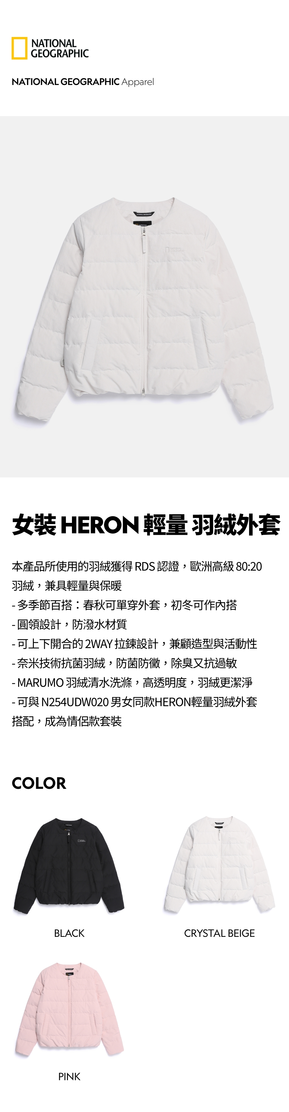 - 可與 N254UDW020 男女同款HERON輕量羽絨外套搭配,成為情侶款套裝