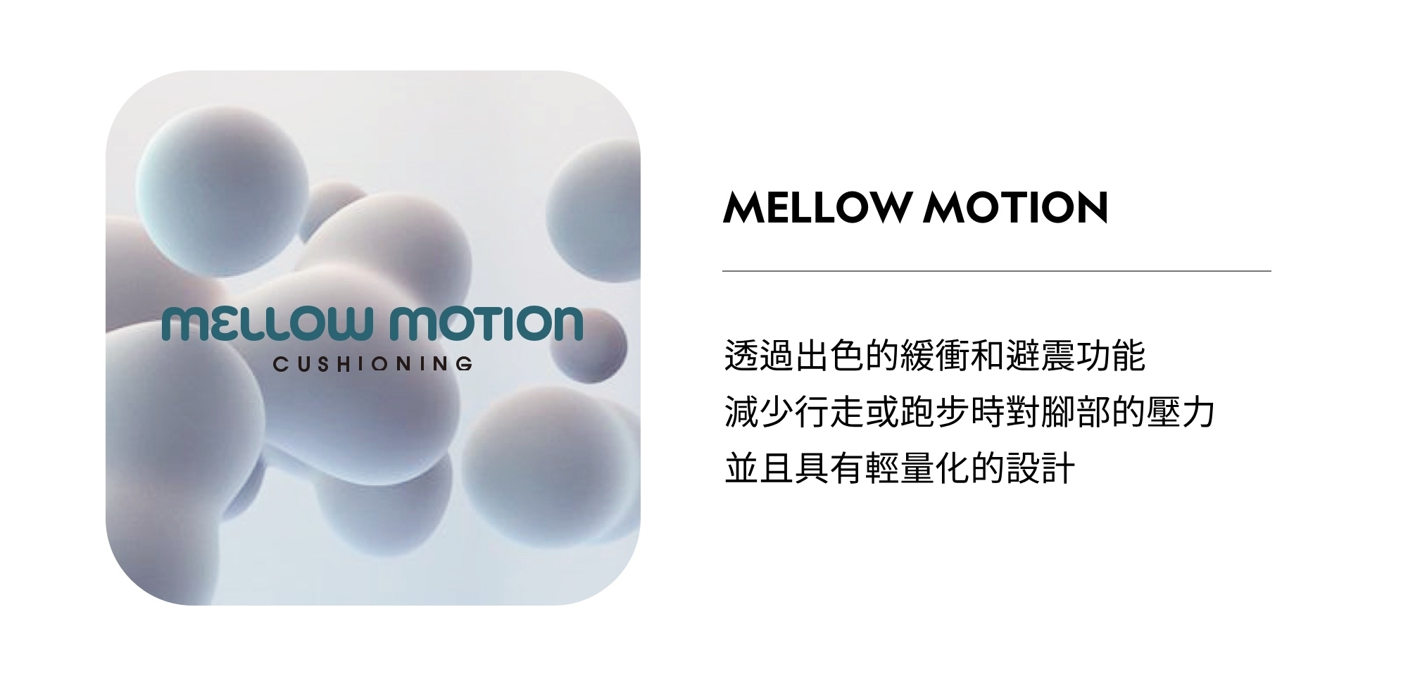 - MELLOW MOTION 材質,卓越的緩衝、避震、輕量化功能,減少行走壓力