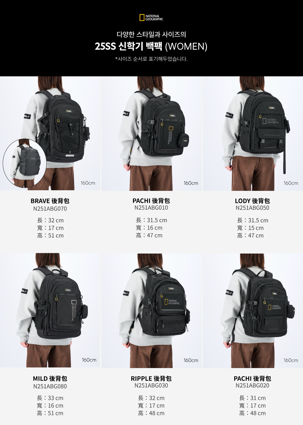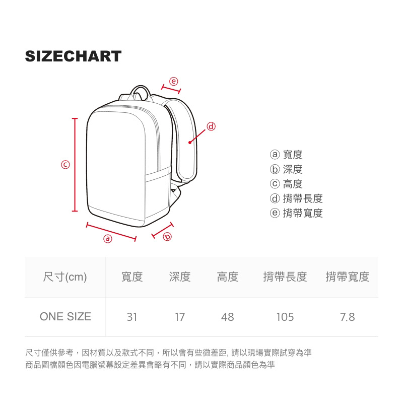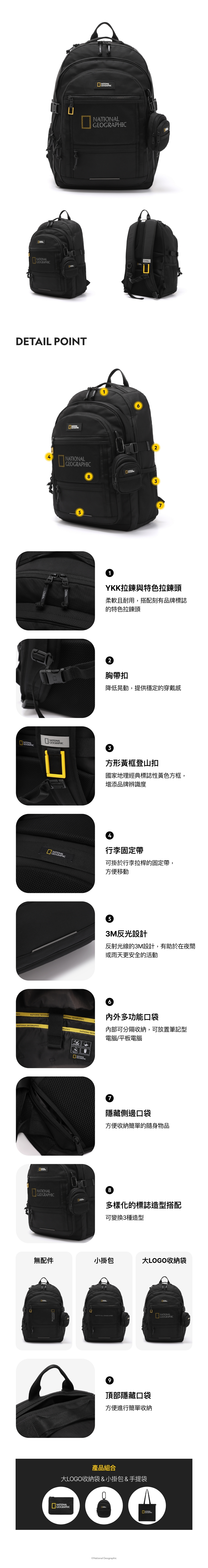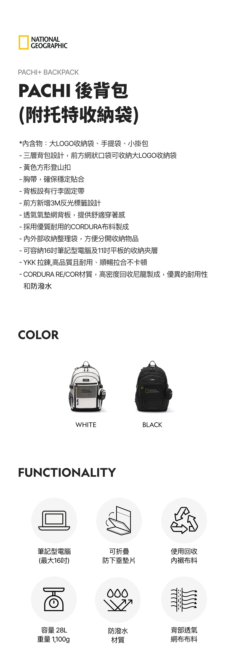 - 三層背包設計,前方網狀口袋可收納大Logo收納袋