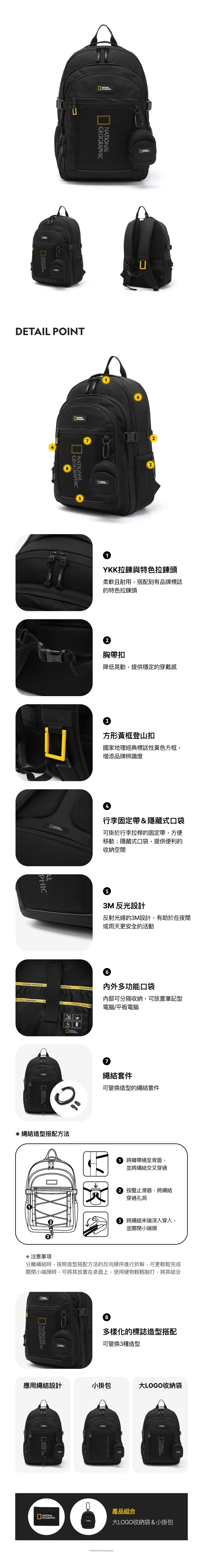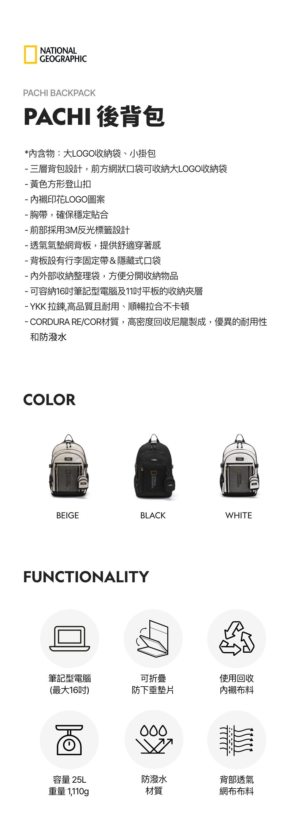 - 三層背包設計,前方網狀口袋可收納大Logo收納袋