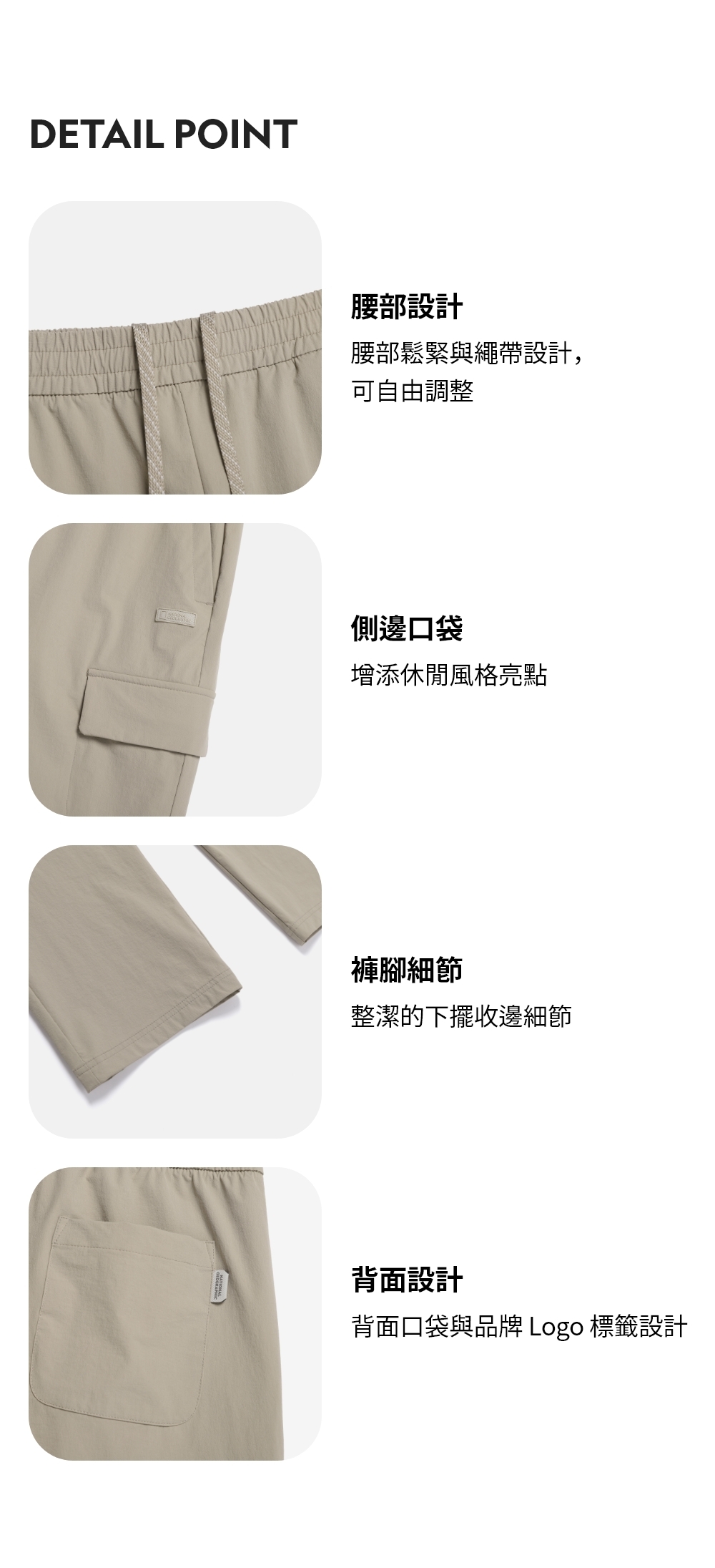 - 腰部採全腰鬆緊加抽繩設計,可自由調整尺寸