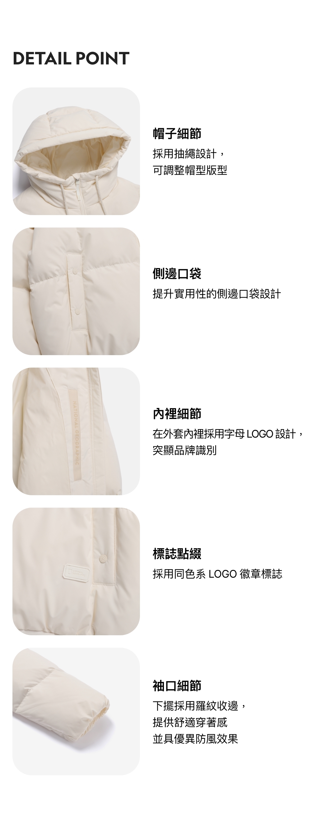 - 內填 80:20 鴨絨,兼具保暖與輕盈