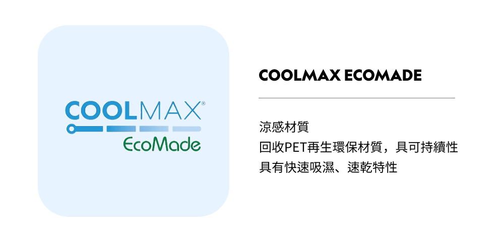 - Coolmax 涼感面料(環保),優異的透氣、吸濕排汗、快乾功能